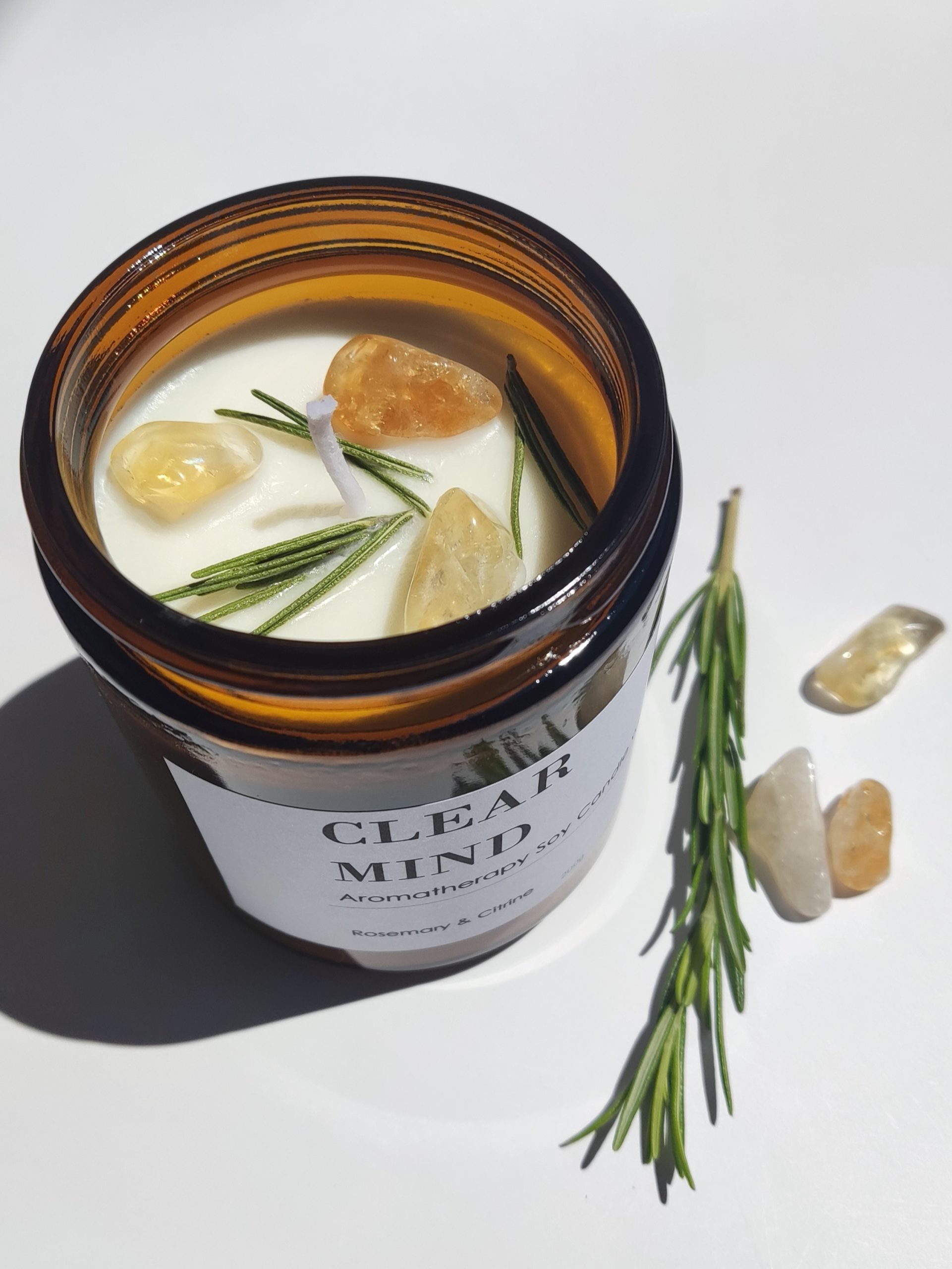 Izdelano iz 100% čistega eteričnega olja rožmarina in čistega sojinega voska. Vsaka sveča je polnjena ročno, prav tako so ročno dodani kristali. Kristali se, ko sveča popolnoma izgori, lahko koristijo za nadaljnjo uporabo.
