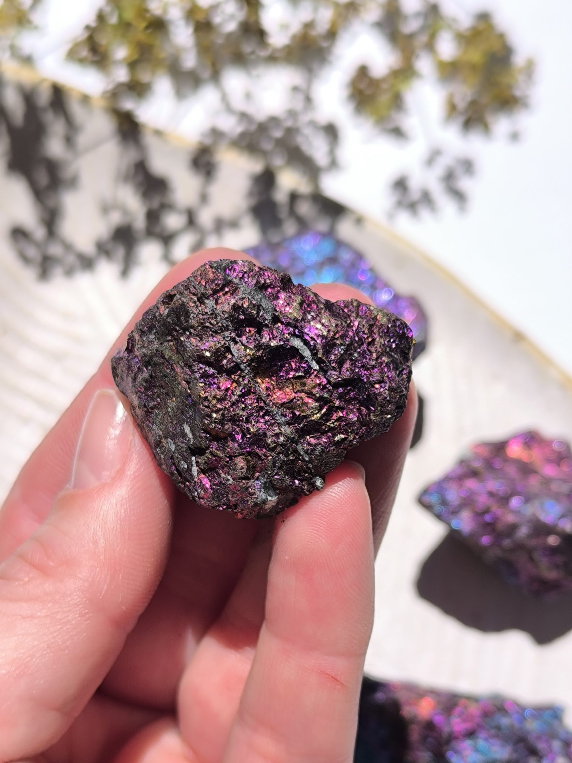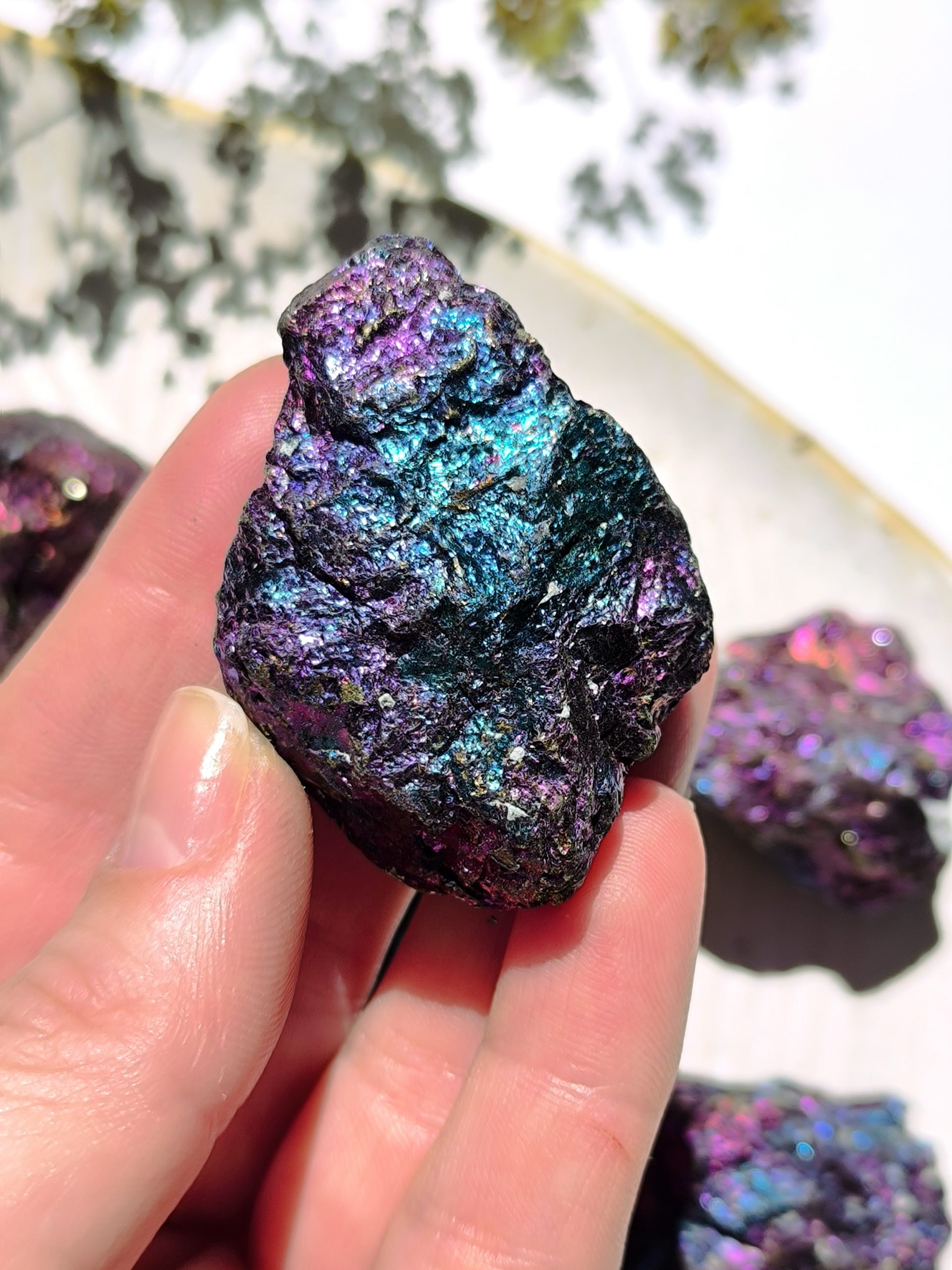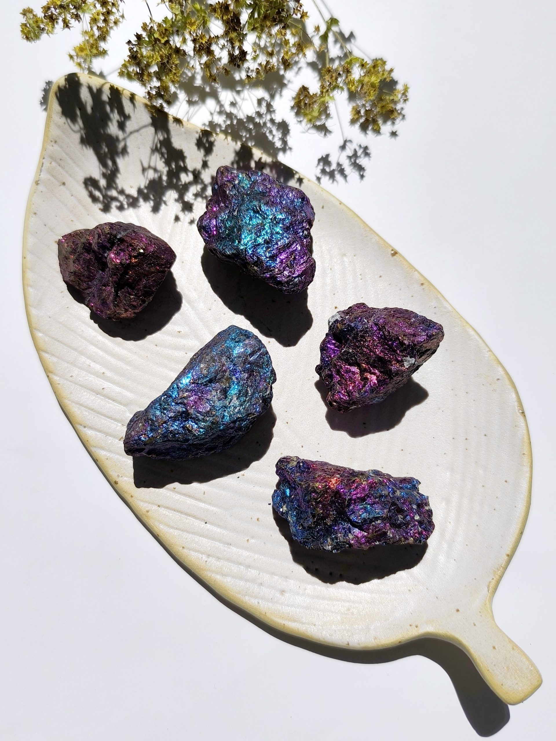 Halkopirit je mineral bakrovega železovega sulfida, ki ga je leta 1725 prvi odkril J. F. Henckel. Ime je dobil po grških besedah ​​za “baker” in “medenina”, najbolj opazen pa je v odtenkih rumene, zelene in sive. Ko je halkopirit izpostavljen kislini, se njegova barvna paleta spremeni v temno vijolično, modro, vijolično in rumeno. Halkopirit se zaradi njegove pisane mavrične bledice včasih imenuje tudi “pavja ruda”.