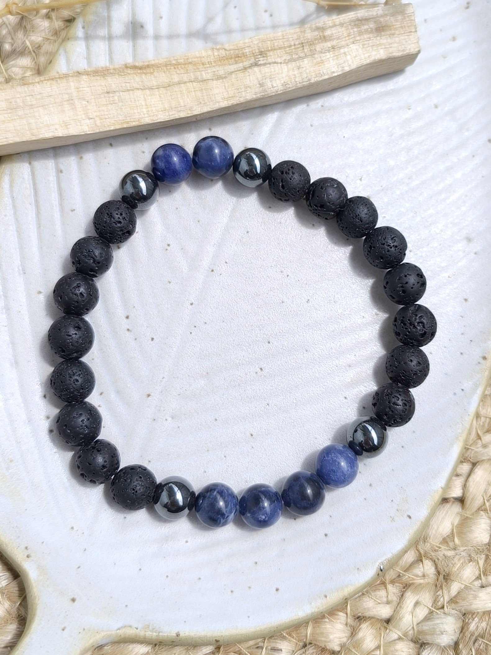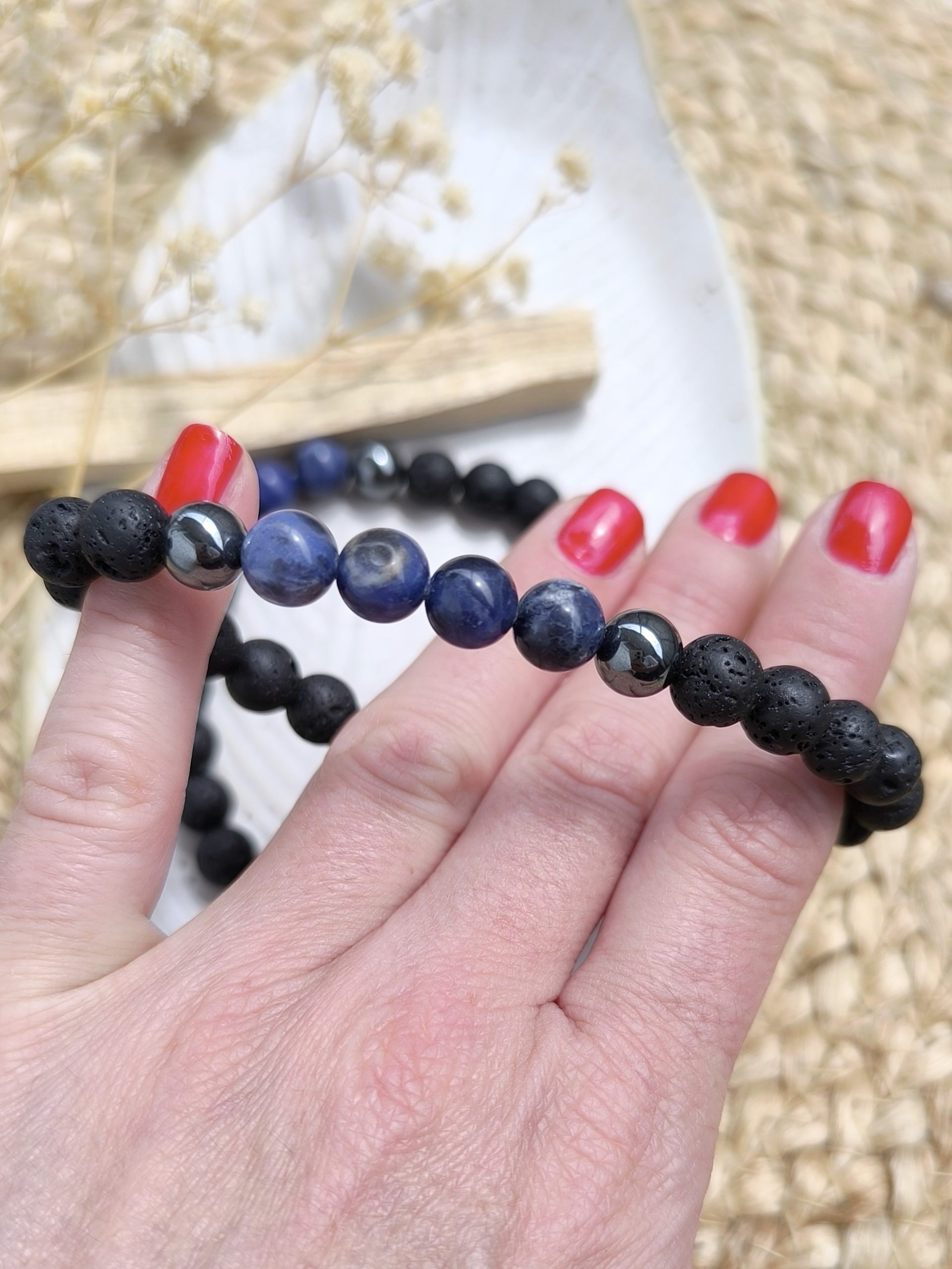 Kombinacija kristalnih kroglic Sodalita, Hematita in kroglic iz lave, bo prinesla mentalno jasnost, logiko in okrepljeno intuicijo. Ta zapestnica, ki je popolna mešanica elegance in prizemljenosti, je hkrati čudovit modni dodatek in vir prizemljenosti.