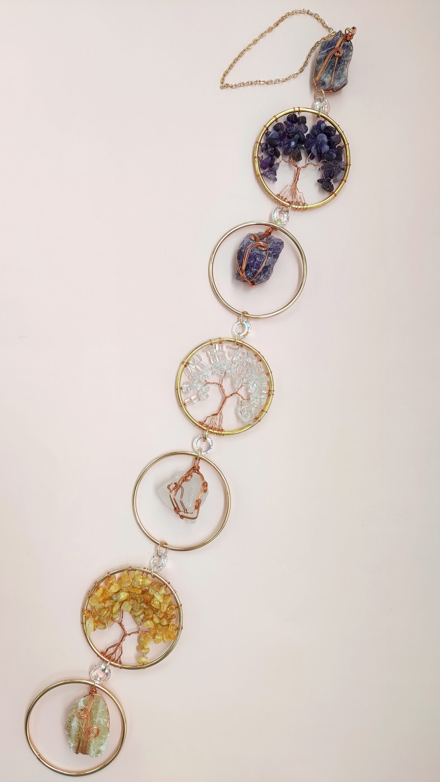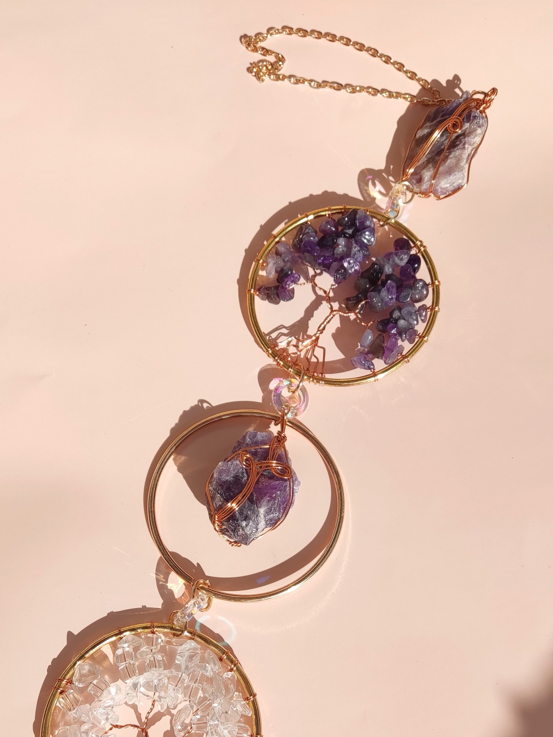 Ta lovilec sonca združuje močno energijo kristalov Ametista, Kamene strele, Citrina in svetega simbola Drevesa življenja (Tree of Life). Postavljen na sončno svetlobo, bo prikazal na stotine mavric.